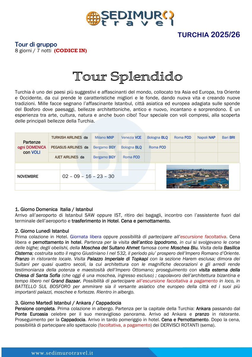 Tour Splendido ogni domenica con volo da mxp, vce, blq, fco, bgy, nap e bri a Novembre 8 giorni