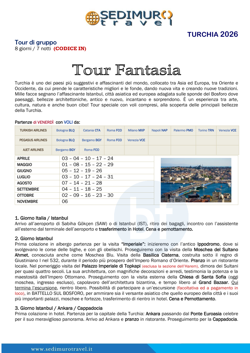 Tour Fantasia con volo da bgy, blq, fco, vce, mxp, nap, cta, pmo, trn di venerdì 8 giorni